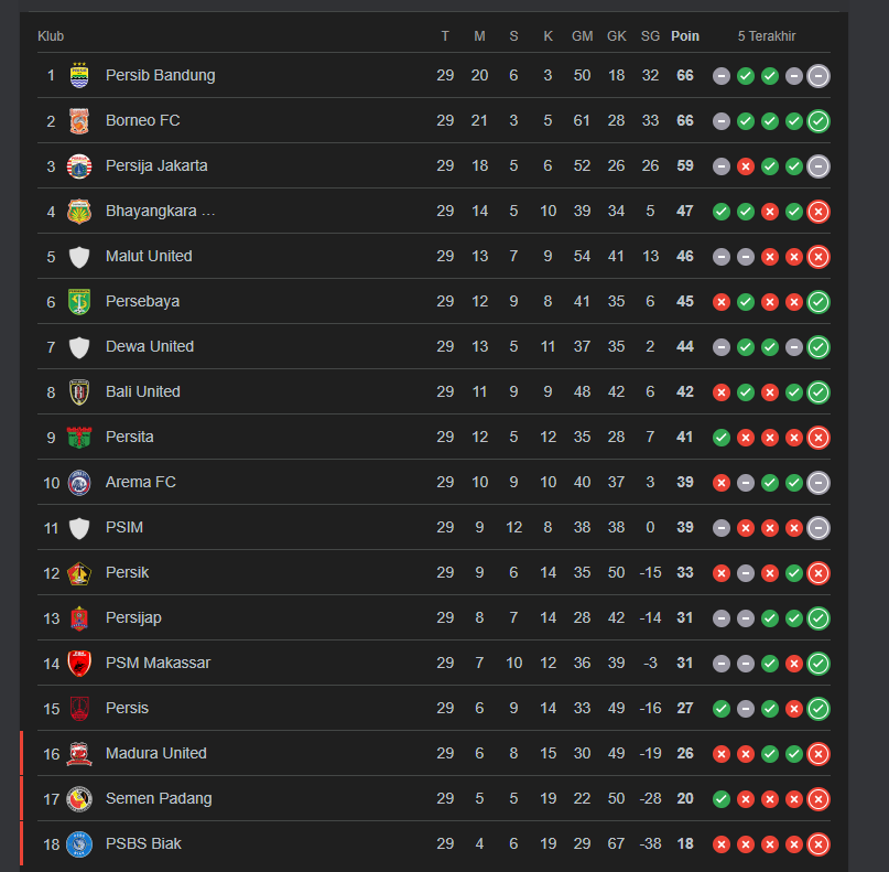 Dengan koleksi 66 poin dari 29 laga, Persib kini harus berbagi posisi puncak dengan Borneo FC. Meski masih berada di peringkat pertama, tekanan kini semakin terasa karena persaingan semakin ketat dan margin kesalahan semakin kecil.